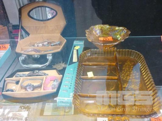 ASSORTED BANGLES, WRIST WATCHES, AUSTRALIAN MILITARY FORCES HAT BADGE, WOODEN LEVEL, CARNIVAL GLASS BOWL & AMBER GLASS TRAY