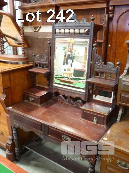 TIMBER DRESSER, 4 x DRAWER, (1 x HANDLE MISSING), BEVELLED TILT MIRROR, STRETCHER BASE, PORCELAIN CASTORS