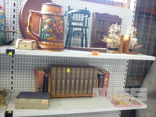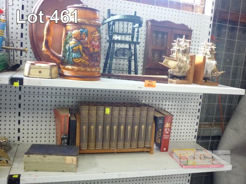 LARGE CERAMIC BEER STEIN, TIMBER TOILET SEAT, BOOK ENDS, CHILDRENS ENCYCLOPEDIA, ETC, 2 x SHELVES