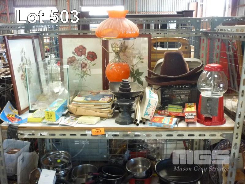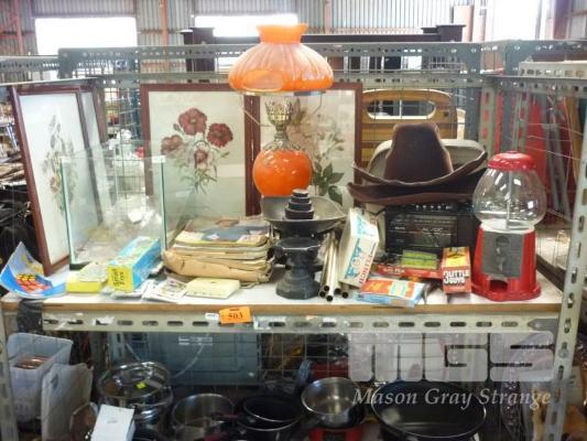 AQUARIUM, TABLE LAMP, HATS,PRINTS, MAGAZINES, ETC