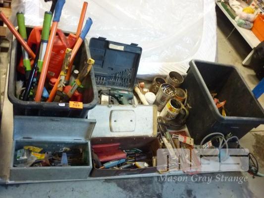 BOSCH ELECTRIC DRILL, MAKITA JIGSAW, RYOBI CORDLESS DRILL/BATTERY/CHARGER, ASSORTED HAND & GARDEN TOOLS