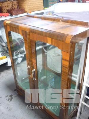 ART DECO, TIMBER VENEER DISPLAY CABINET, MIRROR BACK, ETCHED GLASS, 2 x GLASS SHELVES