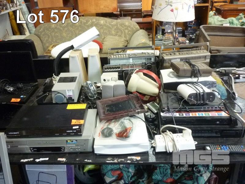 ASSORTED VCR'S, HD RECEIVERS, PORTABLE STEREOS, RADIOS, SPEAKERS, ETC, 1 x TABLE