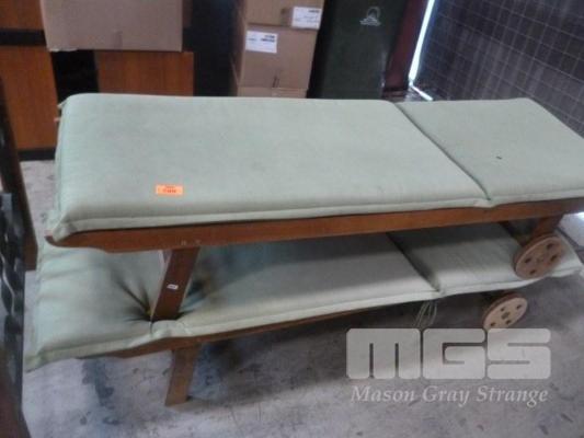 PAIR TIMBER POOL LOUNGES, GREEN CUSHIONS