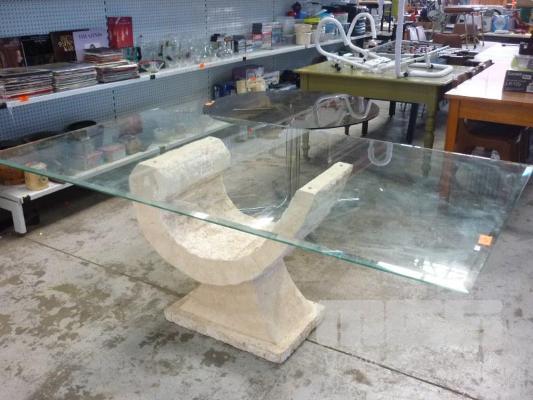 RECTANGULAR DINING TABLE, MARBLE LOOK, RESIN BASE, BEVEL GLASS TOP
