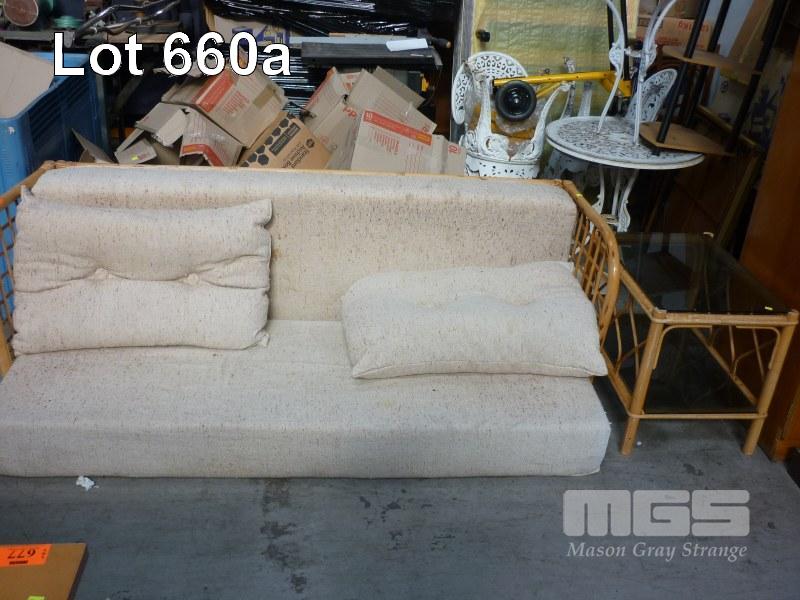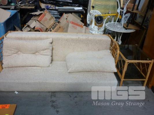CANE LOW LOUNGE, BEIGE CUSHIONS & CANE SIDE TABLE