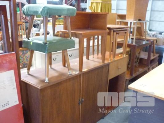 TIMBER RECORD CABINET, MICROWAVE CABINET, NEST OF 3 TABLES, TELEPHONE TABLE & 2 x FOOT STOOLS