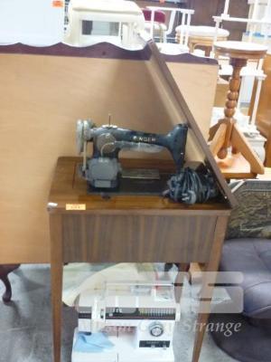 VINTAGE SINGER SEWING MACHINE IN SEWING TABLE, SINGER SEWING MACHINE, (NO PEDAL) & CASE OF ACCESSORIES
