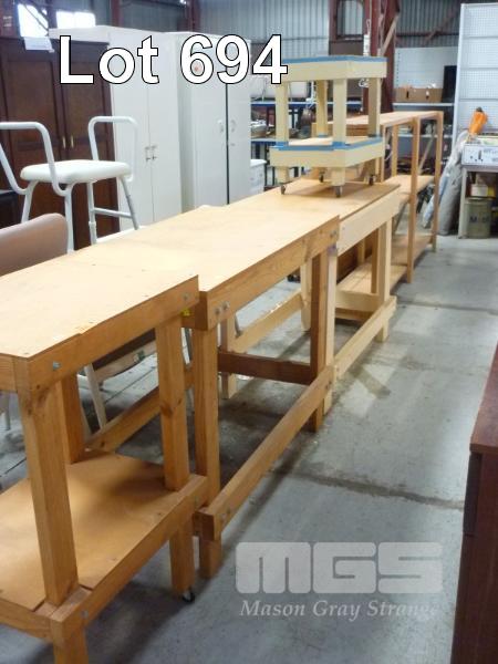 2 x TIMBER WORK BENCHES, 2 x MOBILE WORK BENCHES & TIMBER SHELF UNIT