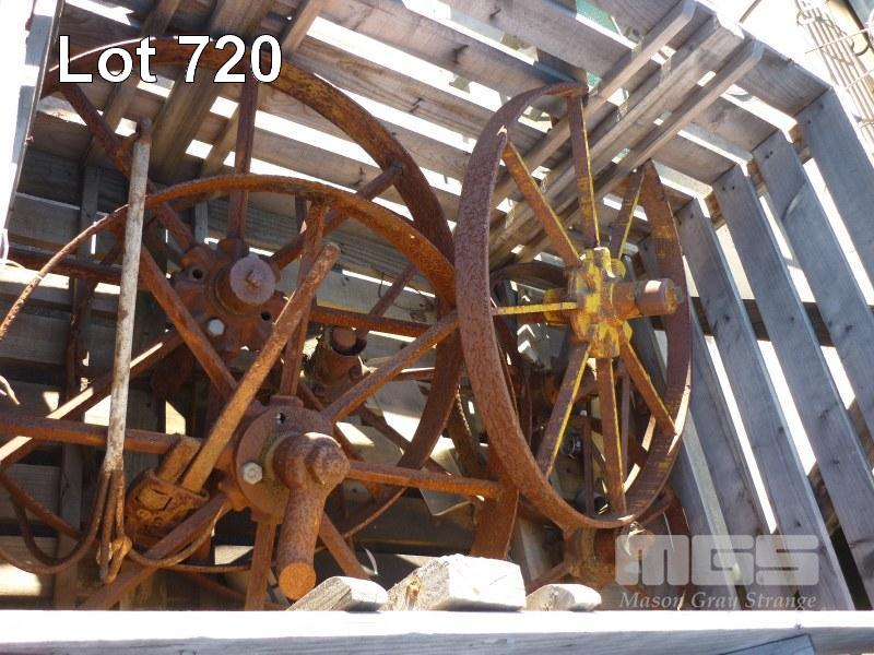 6 STEEL IMPLEMENT WHEELS AND AN ANCHOR
