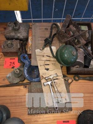 3 x KEROSENE LAMP TANKS WITH WICK MECHANISMS, OLD TINS, VARIOUS HANDLES & INSECT REPELLENT, WOODWORKERS HAND BOOK.