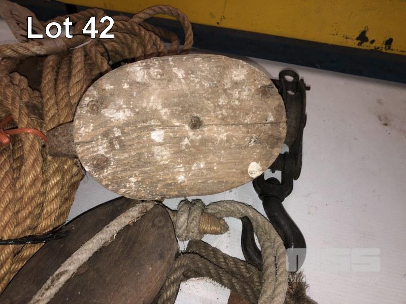OLD SHEAVE BLOCKS, STEEL & TIMBER, (7 x ITEMS), PLUS ROPE WITH 2 x DOUBLE ROW BLOCKS & HOOK