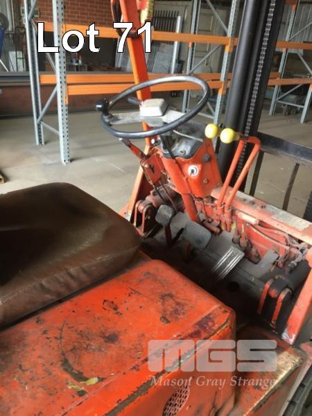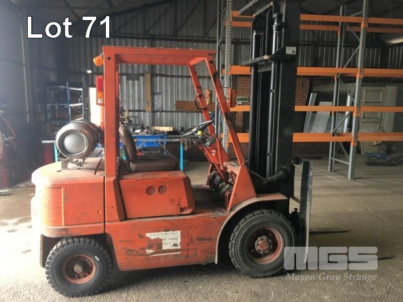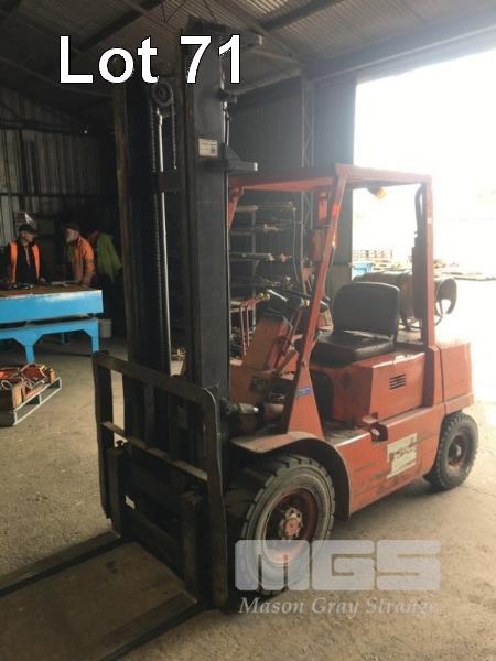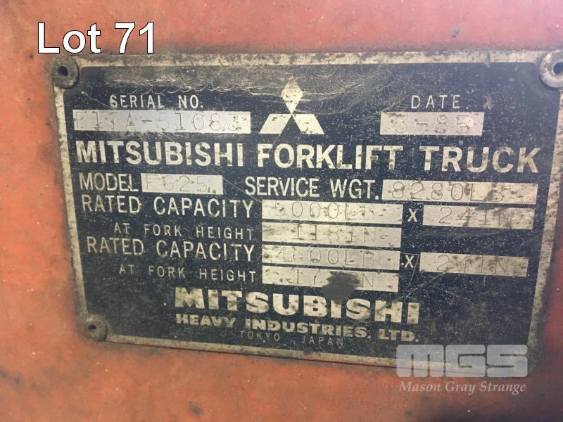 MITSUBISHI FORKLIFT, DOM: 3/85 HOURS: 4,109 LPG, 4 CYLINDER 2 STAGE MAST 5,000LB RATED PNEUMATIC TYRES