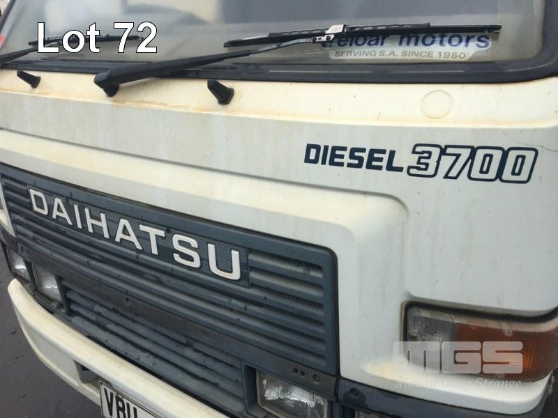 1990 DAIHATSU DELTA SERIES TRAY TOP TRUCK REG: VBU 198 VIN: JDA00V11800051583 ODO: 103,466kms SHOWING GVM: 5,300kg GCM: 6,800kg 5 SPEED DIESEL 3700, DUAL REAR WHEELS TARE: 2250 DROP SIDE TRAY, 2300 x 1980mm SPARE TYRE (NO PAPERS, NO OWNER'S MANUAL, NO SERVICE BOOKS)