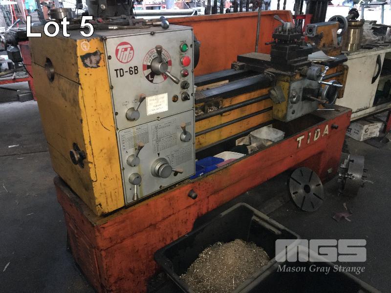 LATHE, TIDA MOD: TD-6B BED LENGTH: 1066mm (BETWEEN CENTRES) SWING OVER BED: 355mm SWING OVER CROSS SLIDE: 230mm SWING OVER GAP: 600mm SPINDLE BORE DIAMTER: 52mm 415V WITH 3 & 4 CAM LOC JAW CHUCKS 2 x STEADIES & FACE PLATE