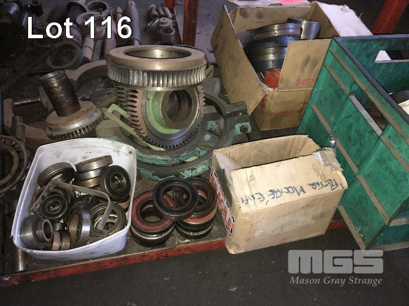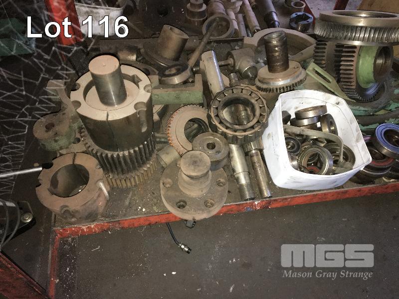 SHAFTS, GEARS, BEARINGS, BUSHES, WITH 3 TIER RACK, TAPER LOCS UNDER BENCH