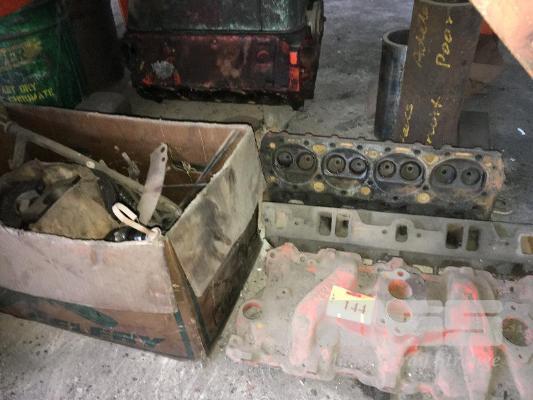 283 CHEV V8 ENIGINE CIRCA 1963 IN PIECES, RODS, PISTONS, BLOCK, CRANK SUMP, CAM SHAFT HEADS & MORE