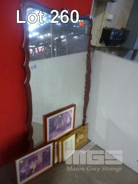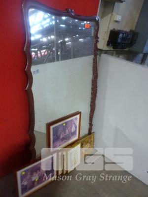 ORNATE TIMBER FRAMED 3/4 LENGTH WALL MIRROR & VINTAGE PRINTS
