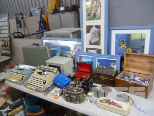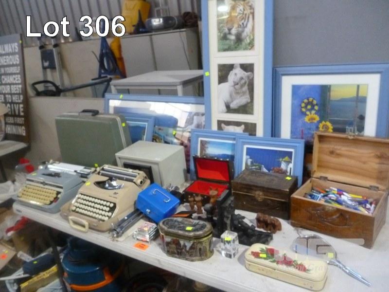 RETRO TYPEWRITERS W/CASES, SAFE WITH KEY, TIMBER CHESTS, BOOK ENDS, PRINTS ETC - 1 TABLE.