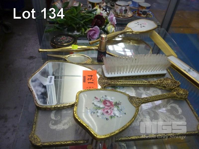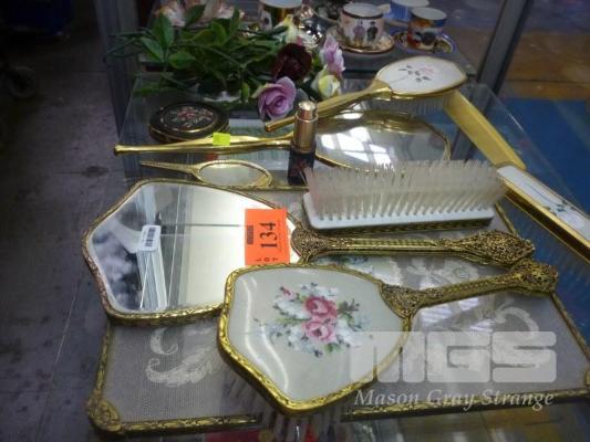 ASSORTED VINTAGE VANITY SET MIRRORS, BRUSHES, CERAMIC FLOWERS, ETC