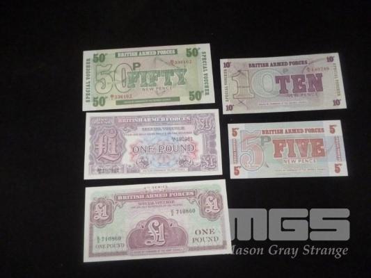 5 x BRITISH ARMED FORCES NOTES 5P, 10P, 50P, 2 x 1 POUND NOTES, APPEAR UNC