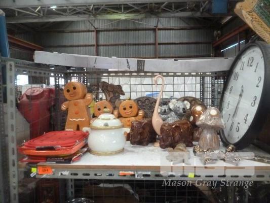 LARGE WALL CLOCK, GLAZED ORNAMENTS, COOKIE JARS ETC