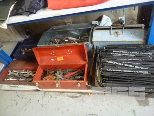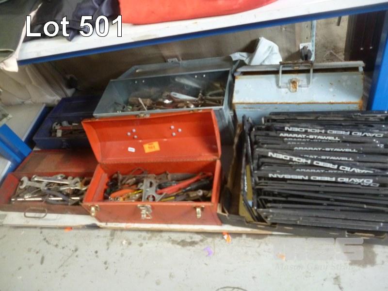 5 x TOOLBOXES WITH ASSORTED HAND TOOLS & BOX NUMBER PLATE SURROUNDS