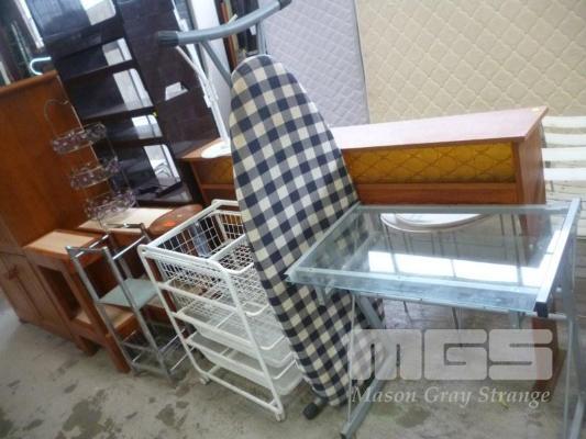 4 x ASSORTED SHELF UNITS, 2 x PEDESTALS, MOBILE DRAWER UNIT, STUDENTS DESK, OFFICE CHAIR, HUTCH & IRONING BOARD