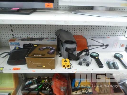 ASSORTED BINOCULARS, VANGUARD CAMERA TRIPOD ETC