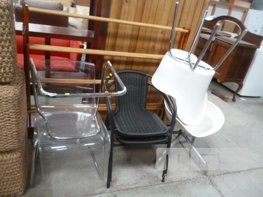 PAIR CURVED PERSPEX DINING CHAIRS, PAIR OUTDOOR ARMCHAIRS, WHITE PLASTIC SWIVEL CHAIR & WHITE PLASTIC ARMCHAIR