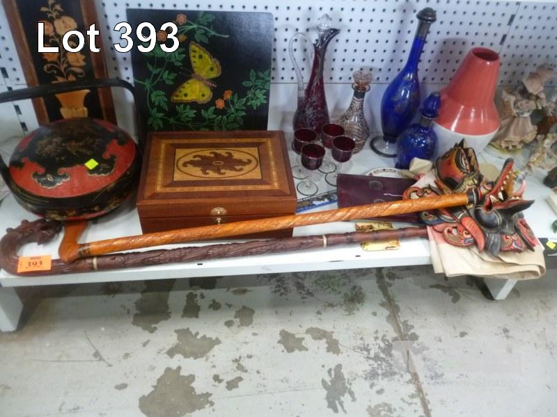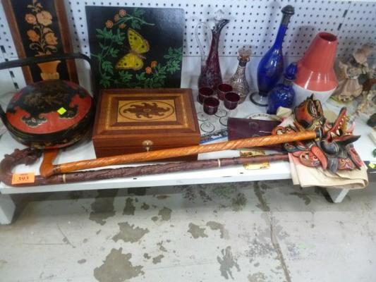 TIMBER INLAY BOX, WALL HANGING, COLOURED GLASSWARE, CARVED TIMBER MASK, ETC