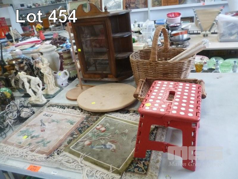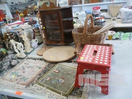 SMALL GLASS FRONTED DISPLAY CABINET, SMALL PRAYER RUGS, CANE WARE, ETC