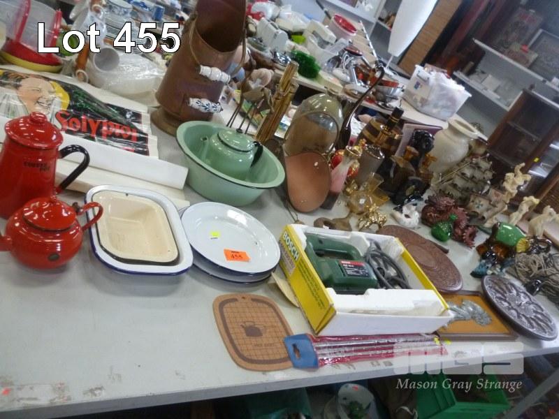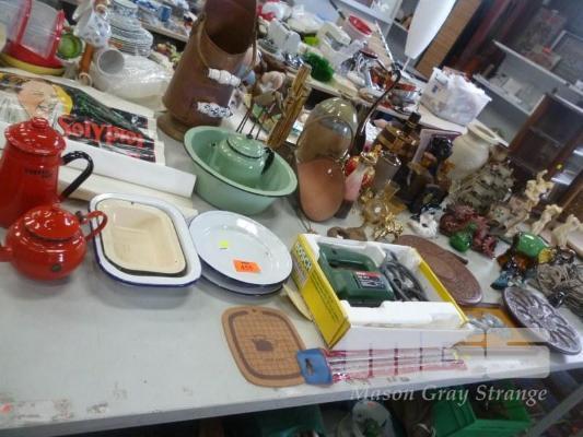 VINTAGE COALPORT, ENAMEL KITCHENWARE, FIGURINES, BOSCH JIGSAW, ETC, 1 x TABLE
