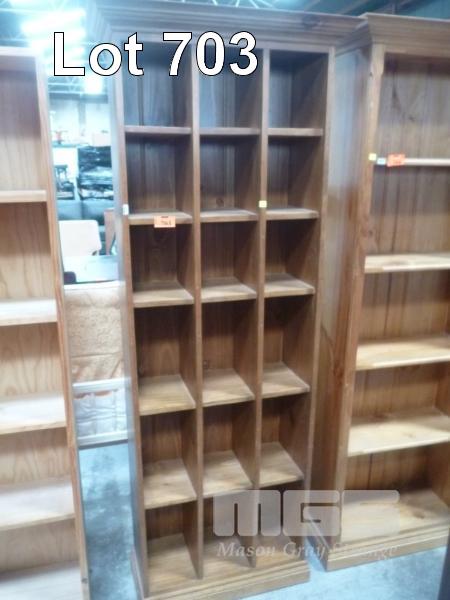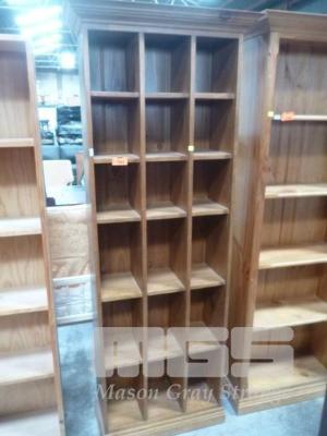 NARROW PINE BOOKCASE, 6 TIER, SECTIONED SHELVES