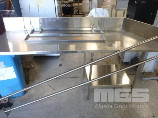 STAINLESS STEEL HANGING DUCK RAILS, 180cm,3 x HANGING SHELVES & IRREGULAR SHAPE BENCH 220 X 70CM