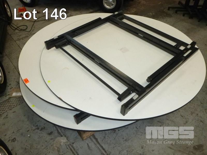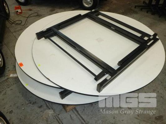 4 x ROUND TRESTLE TABLES, 150cm, WHITE LAMINATE (1 x DAMAGED TOP)