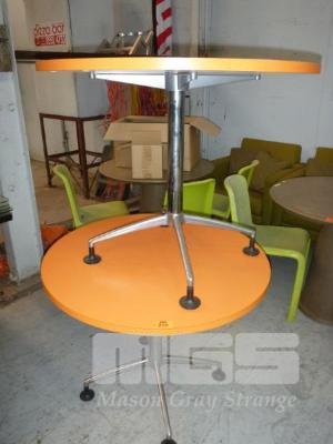 2 x ROUND TABLES, ORANGE TIMBER LAMINATE, 900mm DIAMETER, CHROME STEEL PEDESTAL BASE
