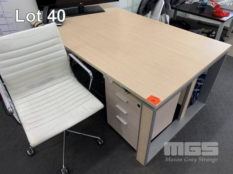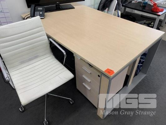CONTEMPORARY OFFICE DESK, 180 x 105cm, BEECH VENEER WITH 3 DRAWER UNDERDESK MOBILE (SLIGHT DAMAGE) & MID BACK EAMES REPLICA, WHITE VINYL OFFICE CHAIR (WITH SPARE GAS LIFT)