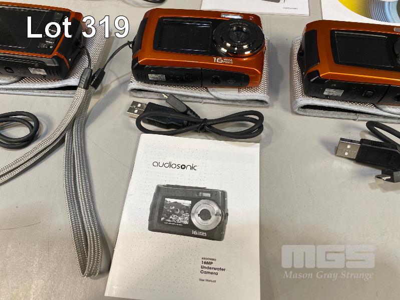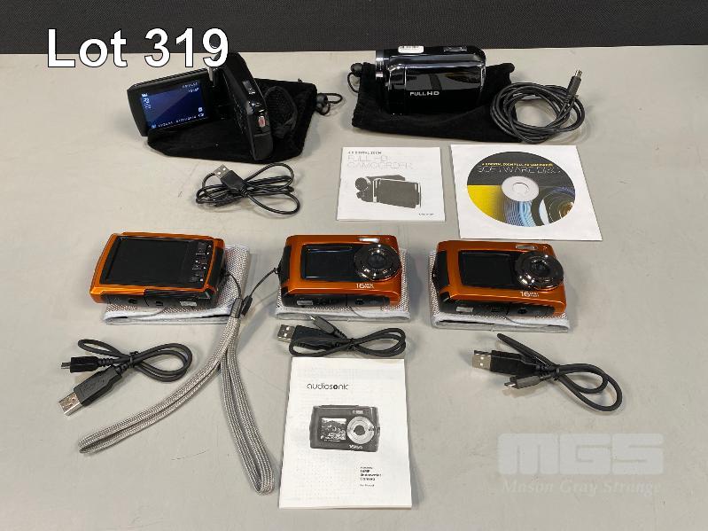2 x FULL HD CAMCORDERS, 4GB CARDS, WITH USB CABLES, 3 x AUDIOSONIC DIGITAL STILL CAMERAS, 2GB CARDS WITH USB CABLES