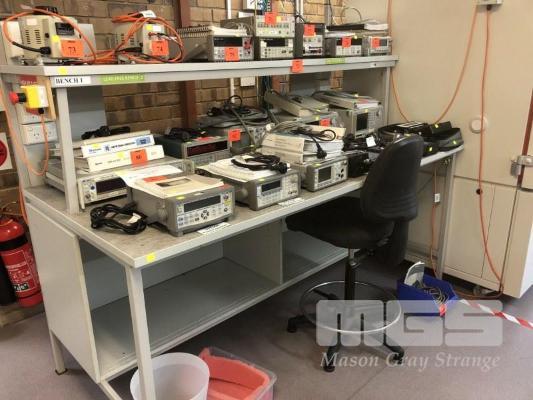 STEEL FRAME WORK BENCH, GREY TIMBER LAMINATE, STATIC GROUNDING 10 x DOUBLE 240V OUTLETS BOTTOM & TOP SHELF UNITS OVERHEAD LIGHTING, 240V 200 x 97 x 230cm (H) & 1 x STOOL