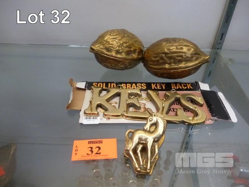 PAIR OF BRASS WALNUT CRACKERS, KEY RACK & UNICORN CLIPS