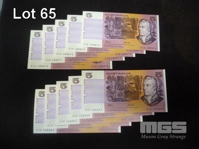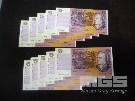 1991 10 x $5.00 CONSECUTIVE NOTES FRAZER COLE UNC