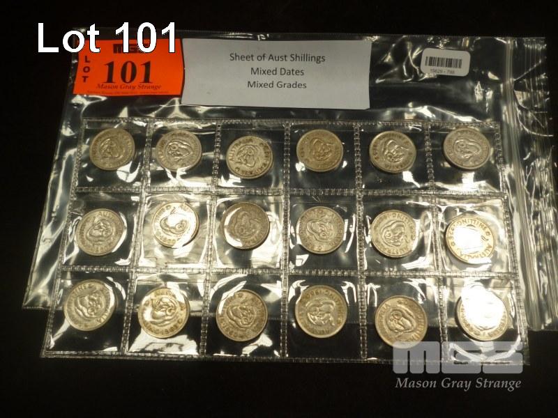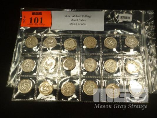 SHEET OF AUST SHILLINGS 18 COINS MIXED DATES & GRADES