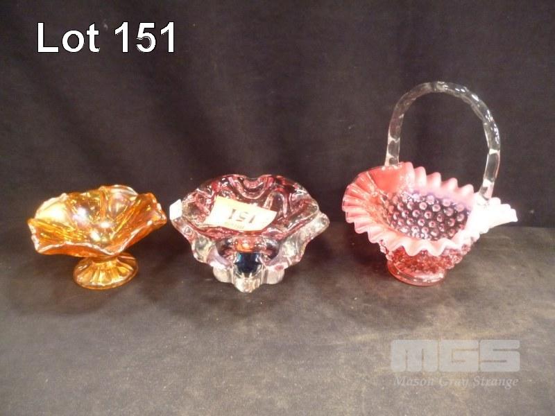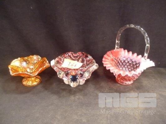 MARIGOLD CARNIVAL GLASS BOWL, EARLY BASKET BOWL & RED/BLUE GLASS ASHTRAY