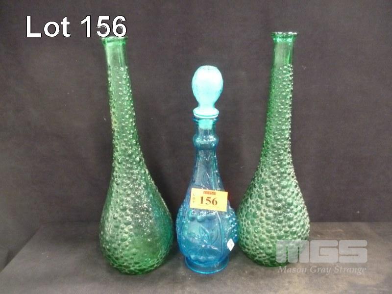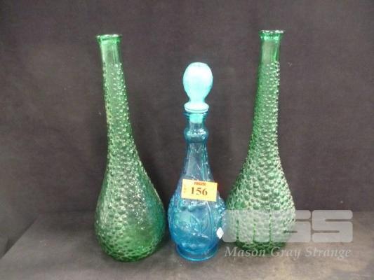 PAIR GREEN GLASS GENIE BOTTLES, (NO STOPPERS) & BLUE GENIE BOTTLE WITH STOPPER