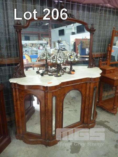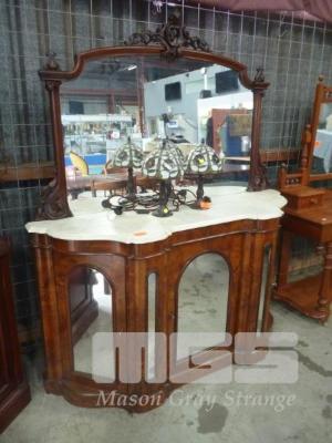 BURL WALNUT VENEER DRESSER, MARBLE TOP, ORNATE CARVED, ARCH MIRROR DOOR UNDERSTORAGE