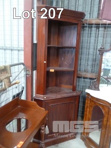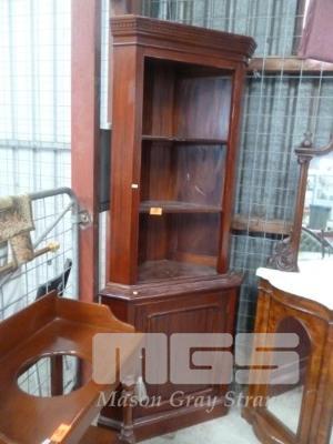 REPRODUCTION ANTIQUE MAHOGANY CORNER BOOKCASE WITH SINGLE DOOR UNDERSTORAGE