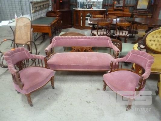 VINTAGE ORNATE, 3 PIECE LOUNGE SUITE, PINK FABRIC, TIMBER FRAME, CERAMIC CASTORS, INC; 2 SEATER & 2 X SINGLES