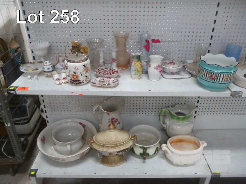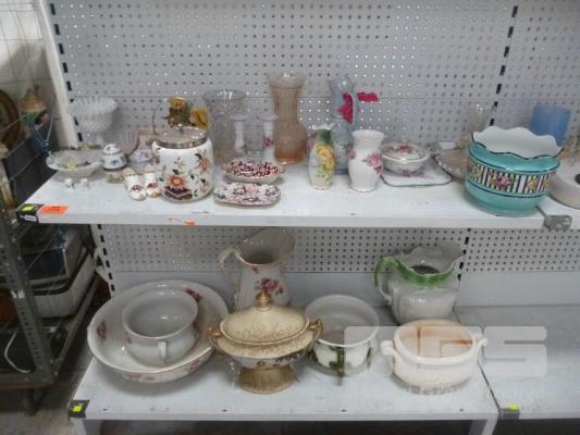 ASSORTED FINE CHINA, WASH BOWLS, VASES, ORNAMENTS, ETC, 2 x SHELVES