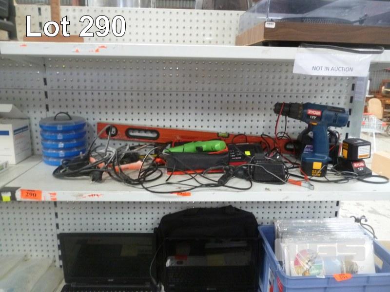 SOLDERING IRONS, DURATECH DRILL, RYOBI CORDLESS DRILL WITH CHARGER & BATTERY, ETC